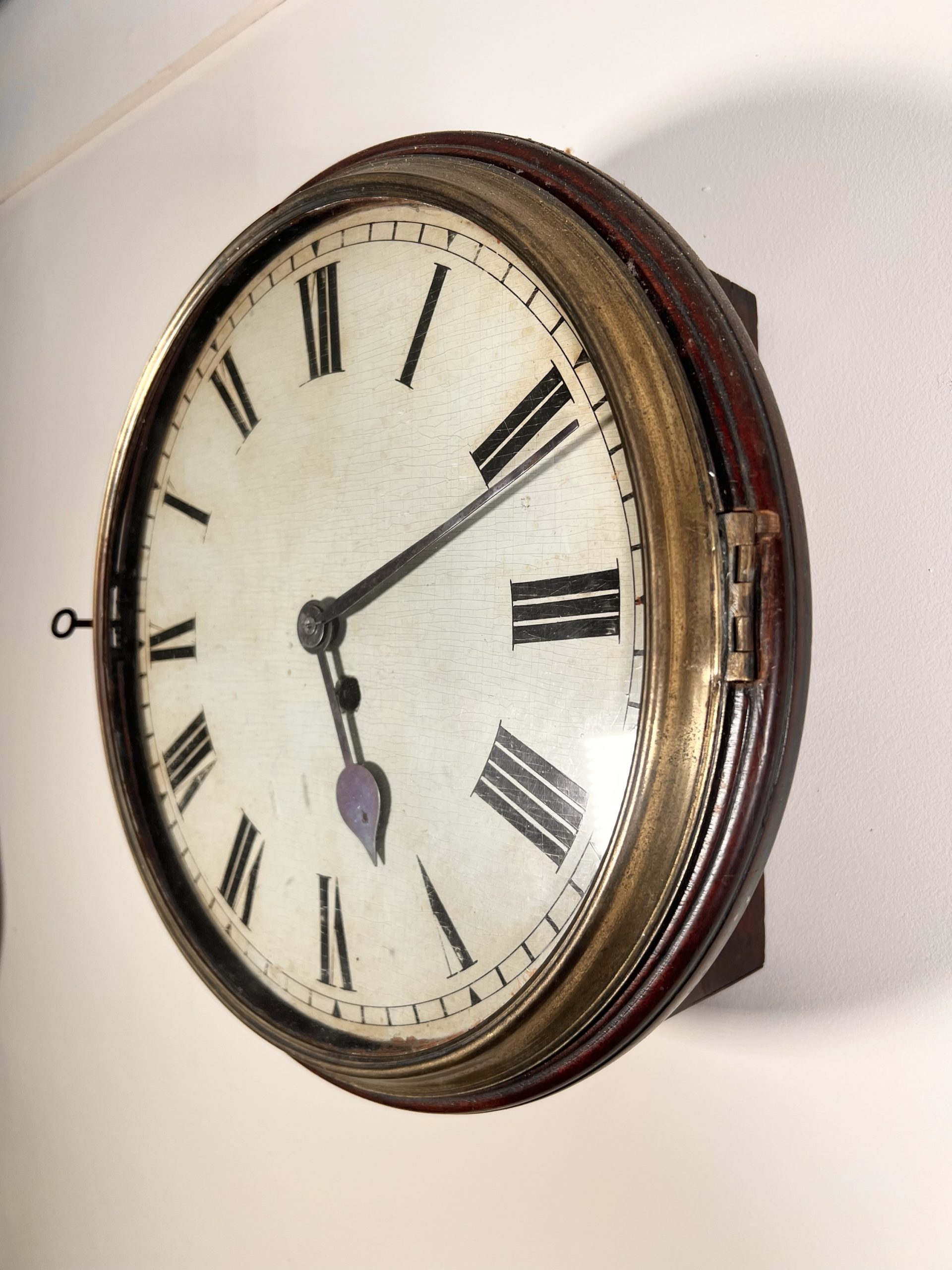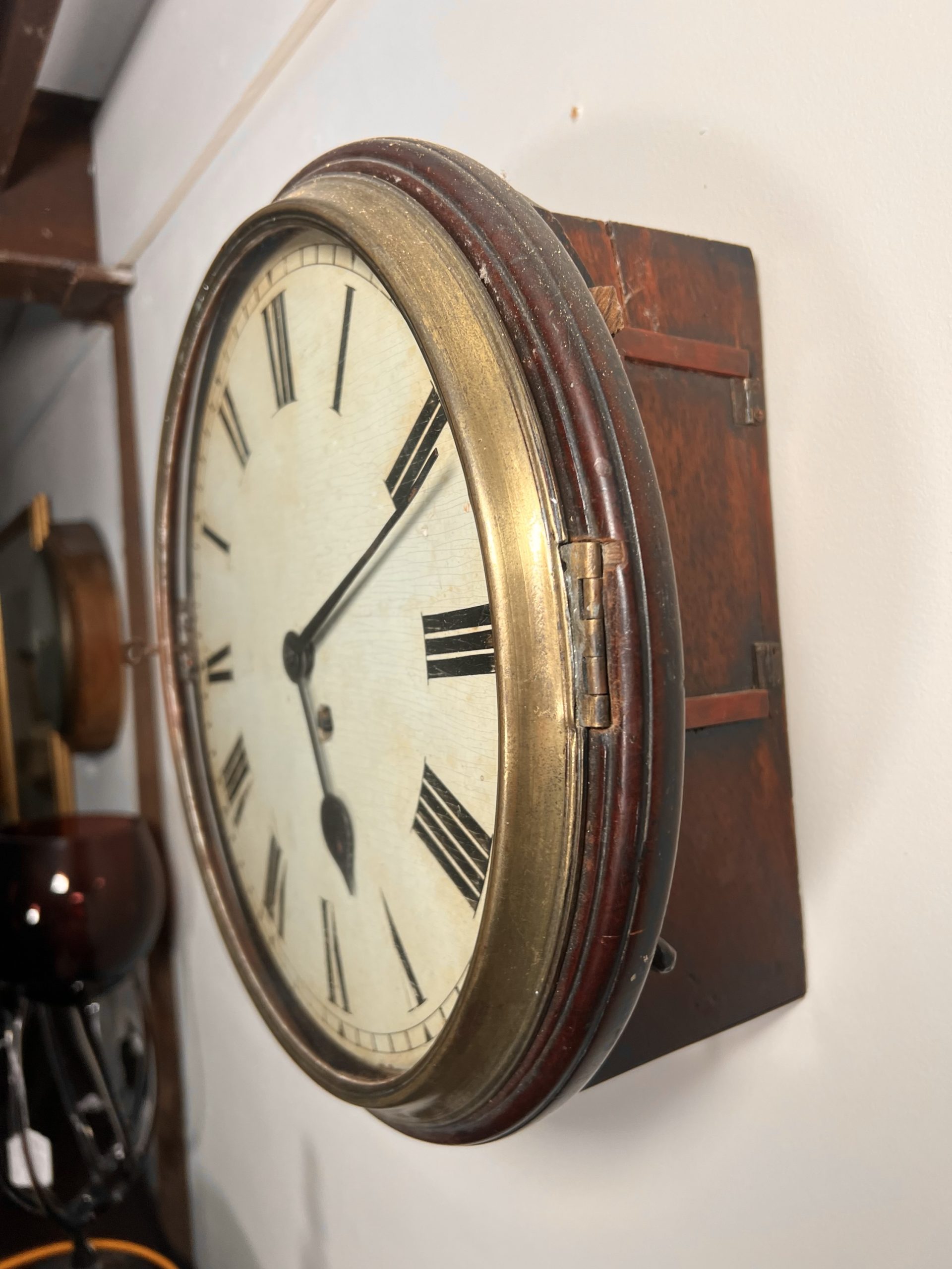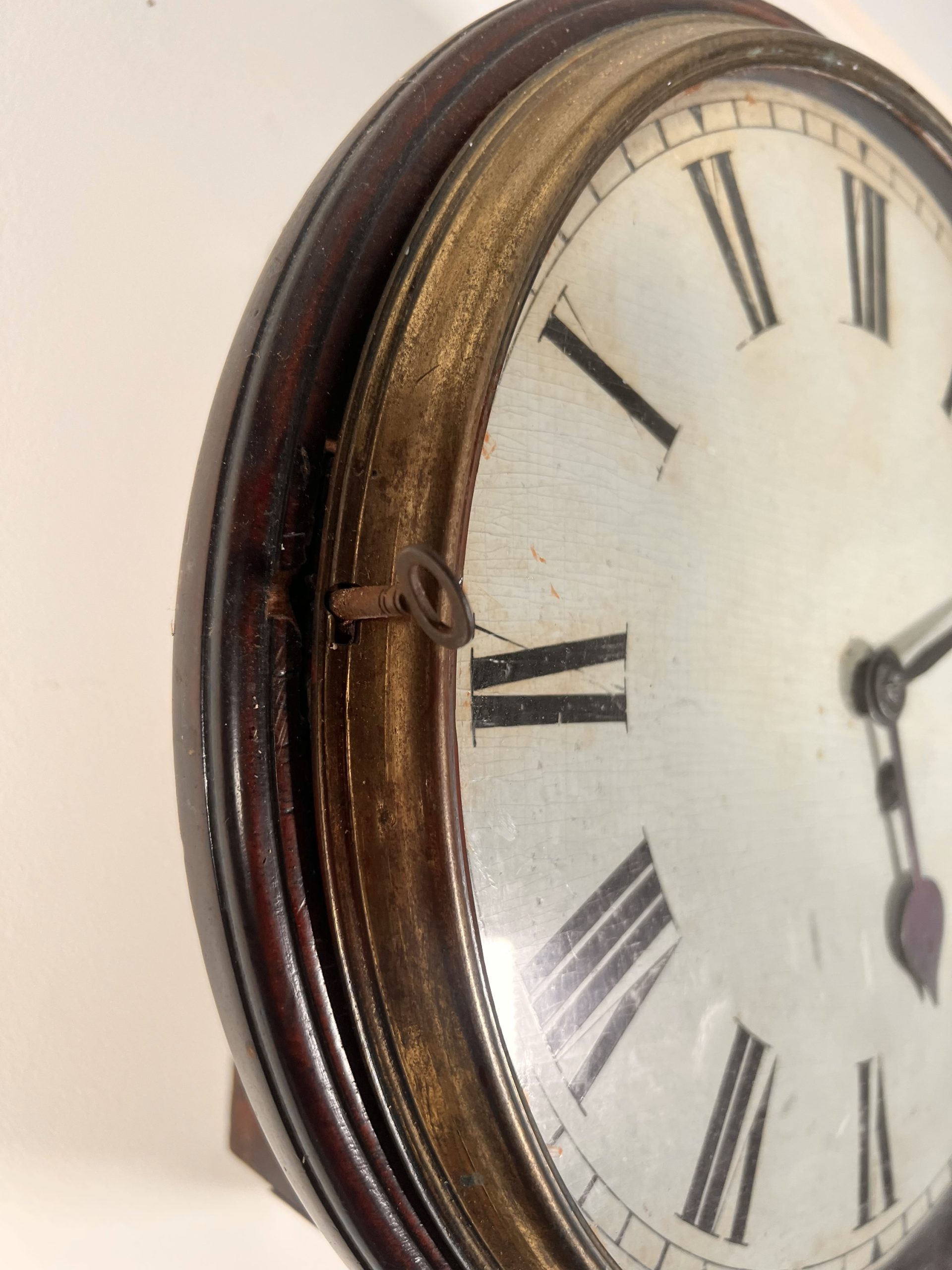 A beautifully figured mahogany dial wall timepiece which is quite rare being a very early one, with a lovely original finish with a deep rich patina that only years of polishing can produce, having an eight day Fusee movement, the wooden twelve inch or 30cms painted circular dial has contrasting black Roman hour numerals and blued hands with amazing patina, a cast brass bezel and glass within a moulded circular surround, having a lockable bezel with working key, the apron flanked by a shaped moulding, it has a side inspection door and one to the base, complete with its original pendulum and winding key, I am happy to deliver locally for a small fee or pack and post nationally