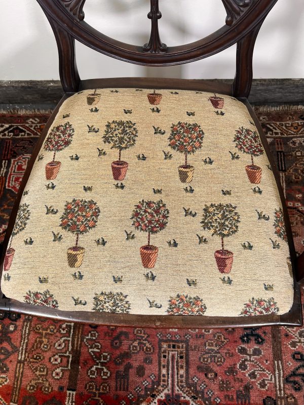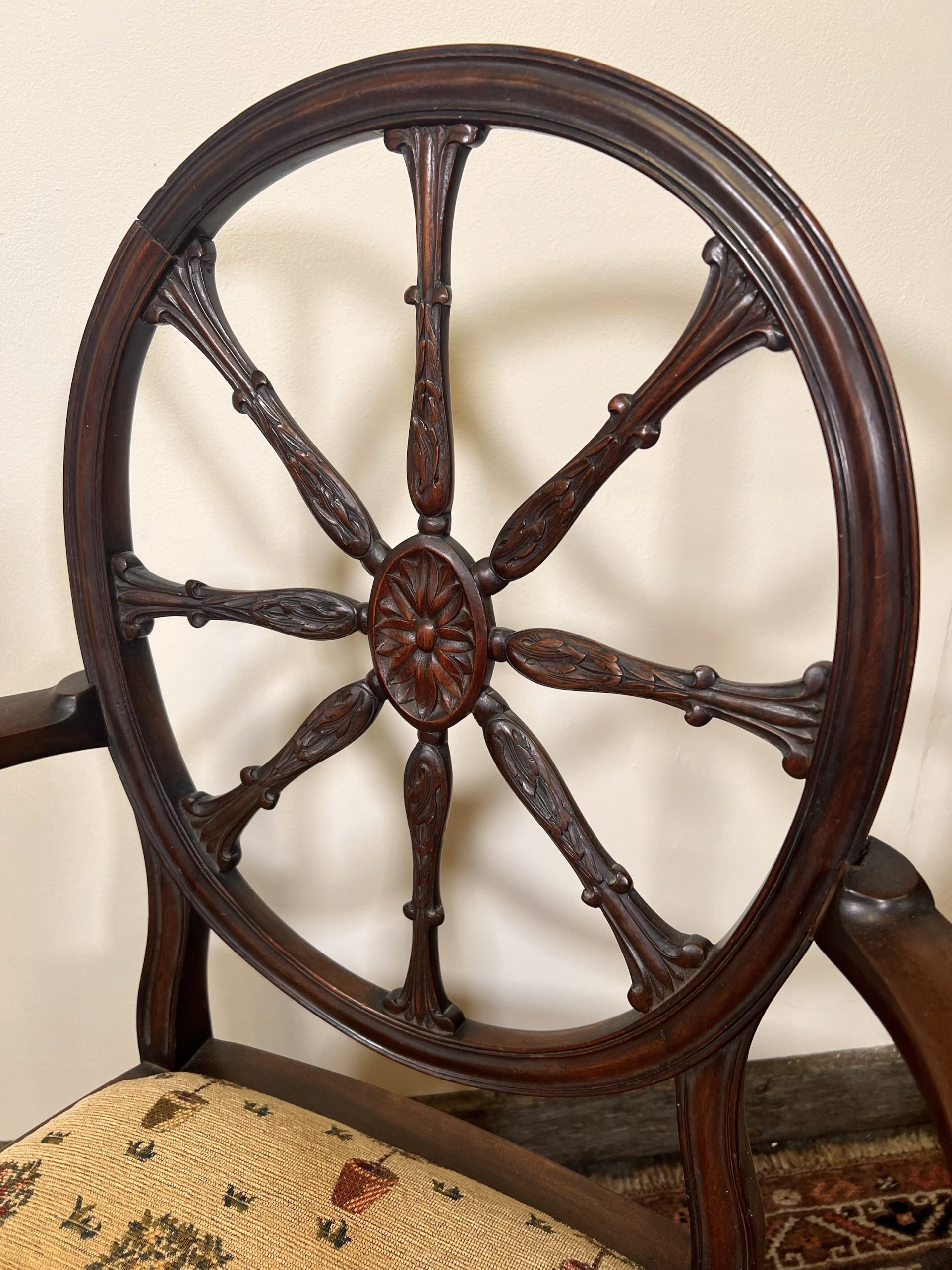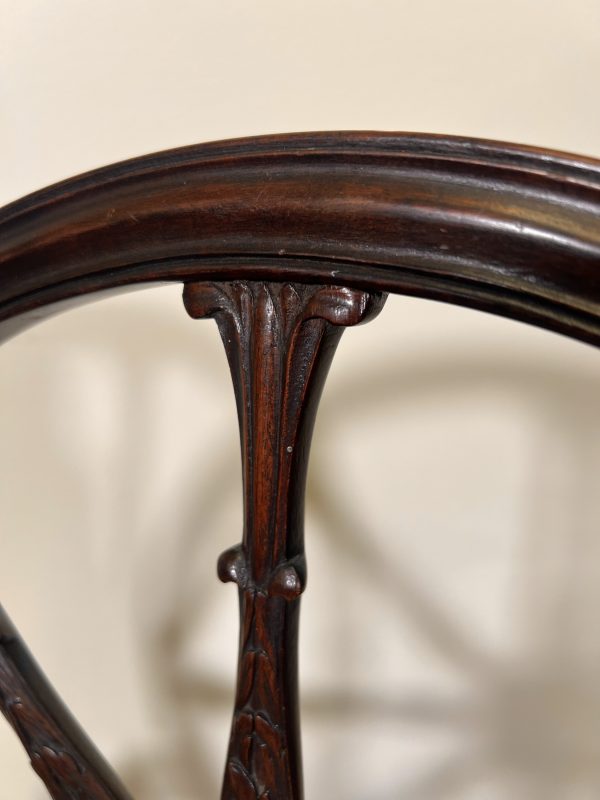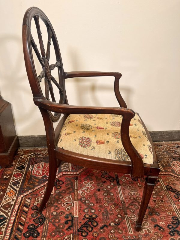 For sale is a superb Federal-style carved mahogany armchair, dating from around circa 1800. This elegant piece features moulded scroll arms and a beautifully carved wheel-back, showcasing the refined craftsmanship associated with the period. The chair stands on square reeded legs with intricate carved detail to the tops and classic spade feet, giving it a wonderfully balanced and graceful silhouette. Recently re-upholstered and re-webbed, the chair offers excellent comfort while retaining its original sophistication—making it both a practical seat and a striking decorative piece. The style is believed to have been introduced by Major General Isaac Ridgeway Trimble, adding historical interest and charm. The dimensions are 56cms wide 47cms deep 47cms to the top of the seat and 96cms to the top of the back, I am happy to deliver locally for a small fee, or arrange a courier nationally