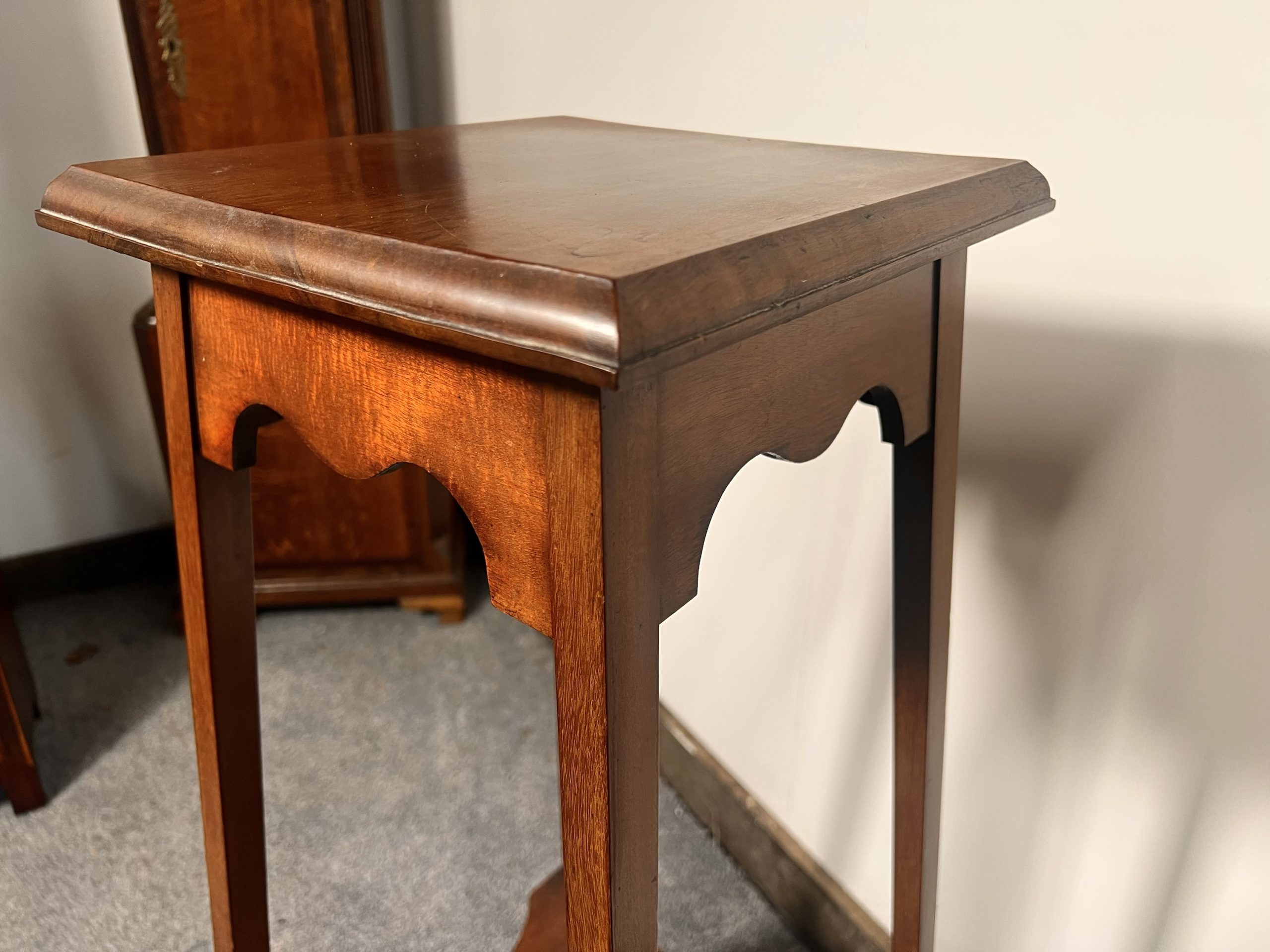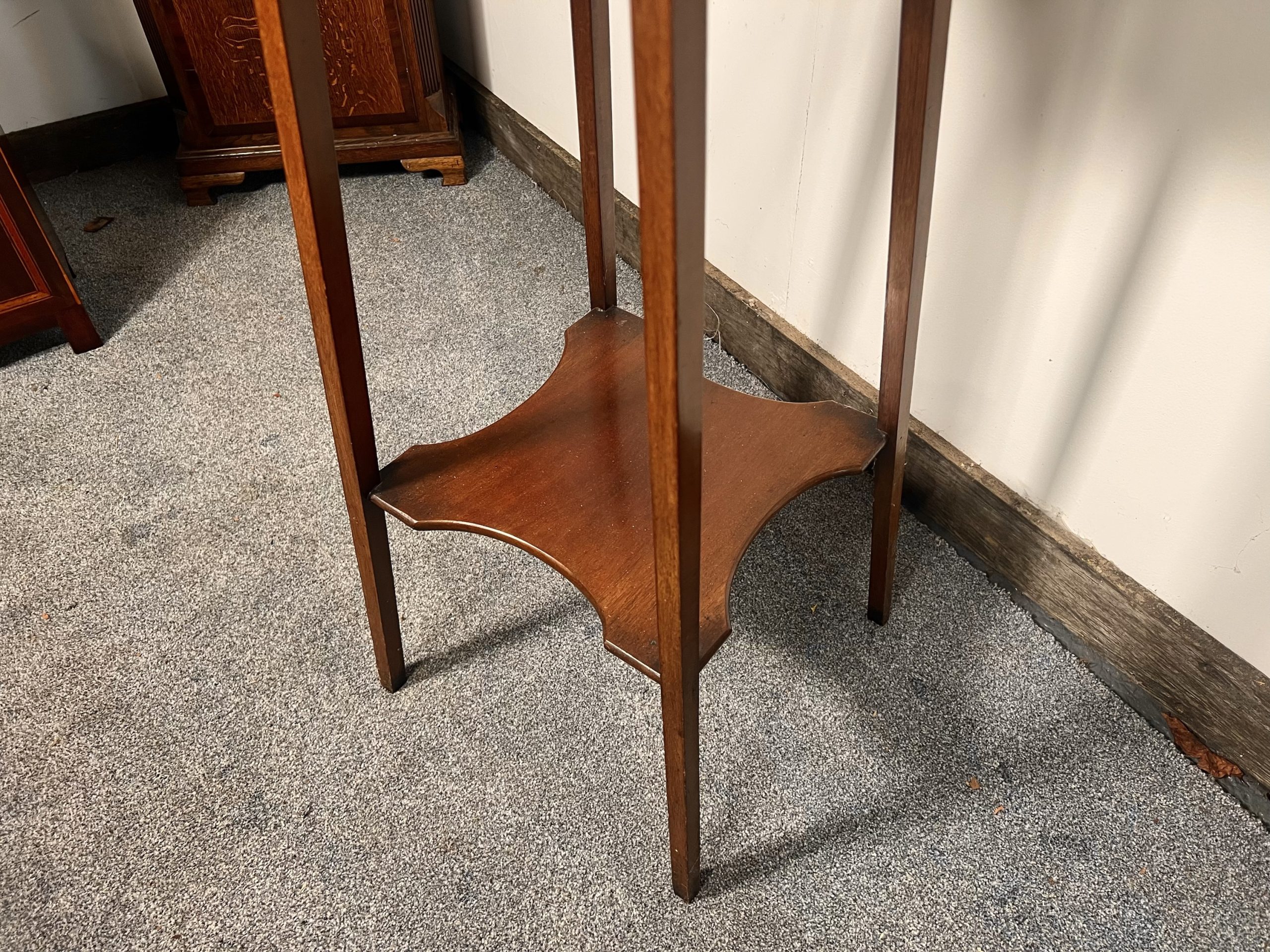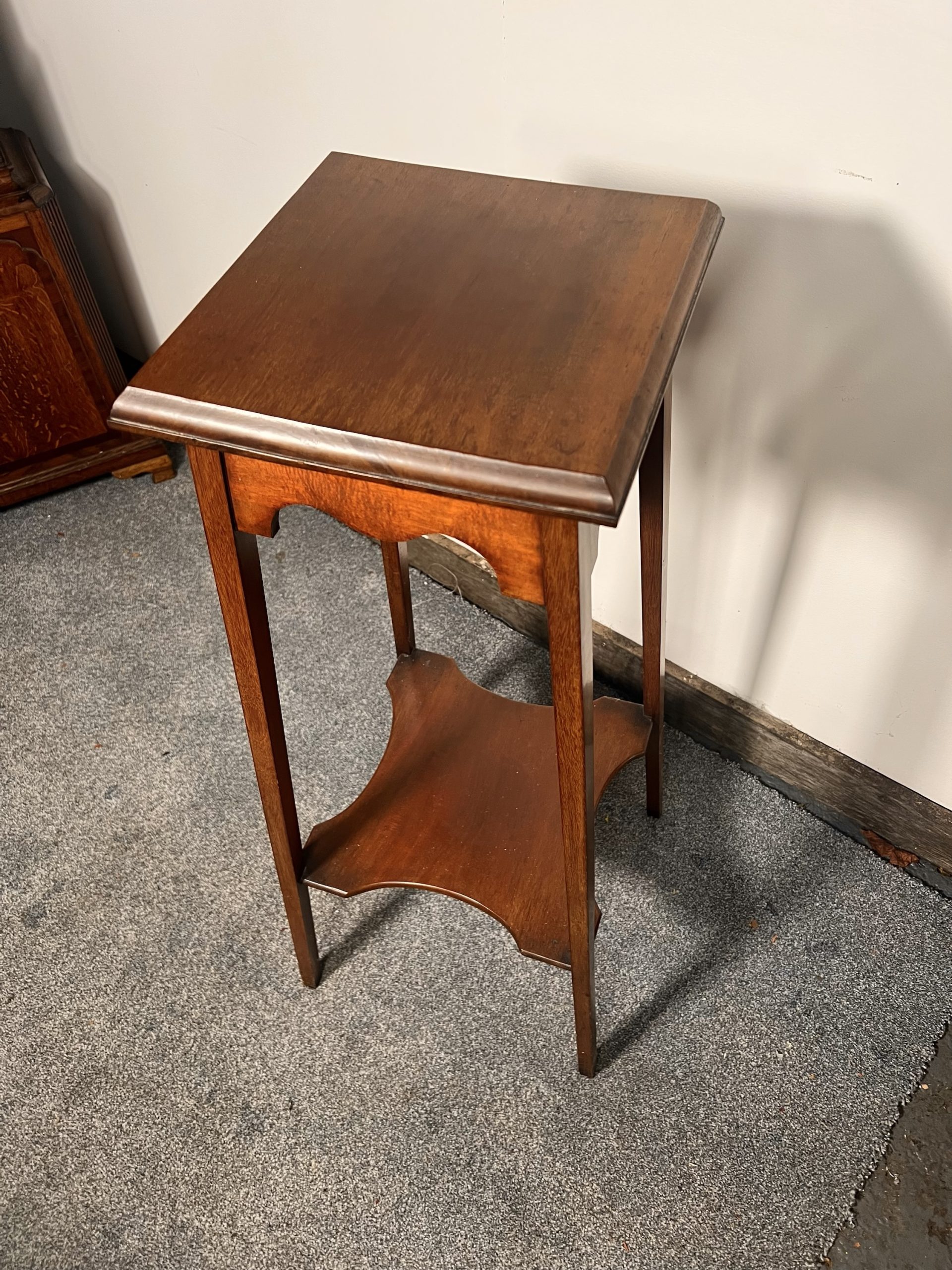 Crafted in beautifully figured solid mahogany. This tall stand displays tremendous Arts & Crafts style and offers versatile use as a stand-alone table, plant stand, or an elegant display stand for ornaments or decorative objects. Designed in the style of classic Liberty & Co. Arts and Crafts manner, the stand rises from elegant tapered legs, showcasing the classic mirrored detail at the base, and is united by a mid-level under-tier shelf with a finely carved surface, adding both visual interest and practical storage. and gives extra stability to the piece, above, a beautifully executed concave carved frieze leads to the superior quality top, which displays gorgeous rich colour, highlighting the craftsmanship and attention to detail throughout. The whole piece retains a desirable original finish and is in excellent antique condition, with no issues to note. the dimensions are xxcms wide standing xxcms tall, I am happy to deliver locally for a small fee, or arrange a courier nationally, please feel free to visit our new showroom in Bretherton, or website https://theoldcornmill.co.uk/ 547