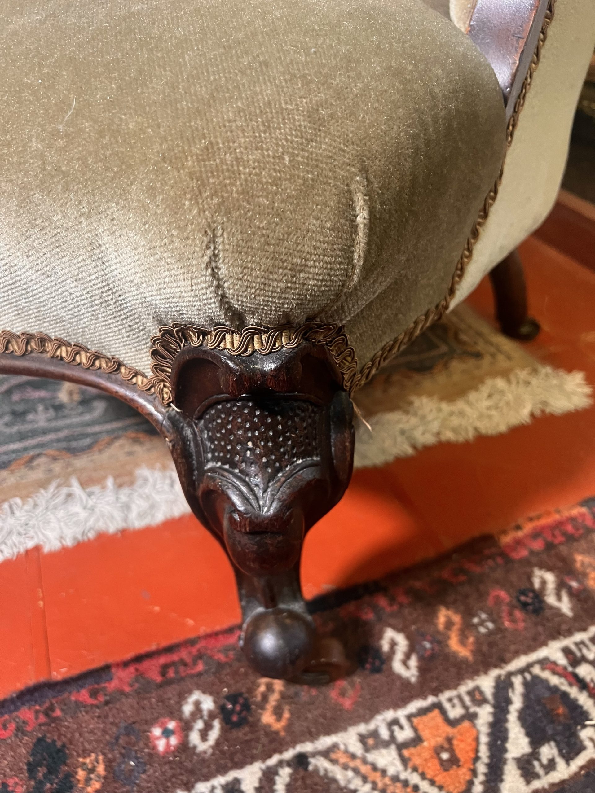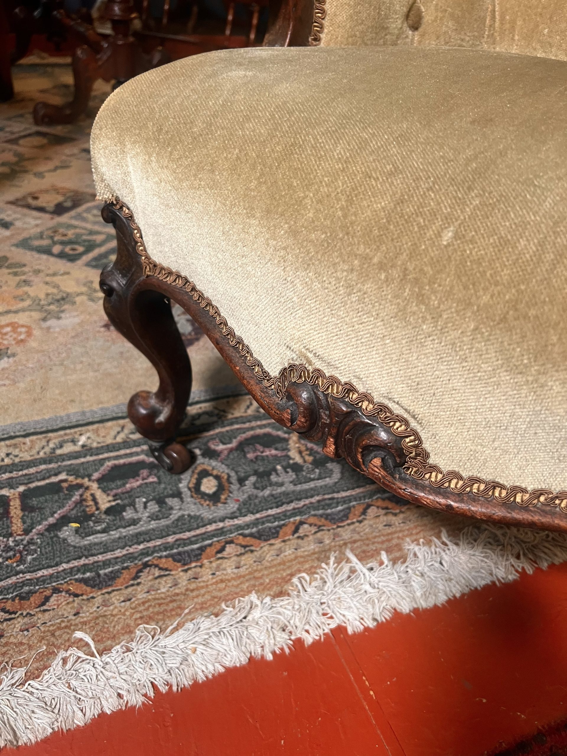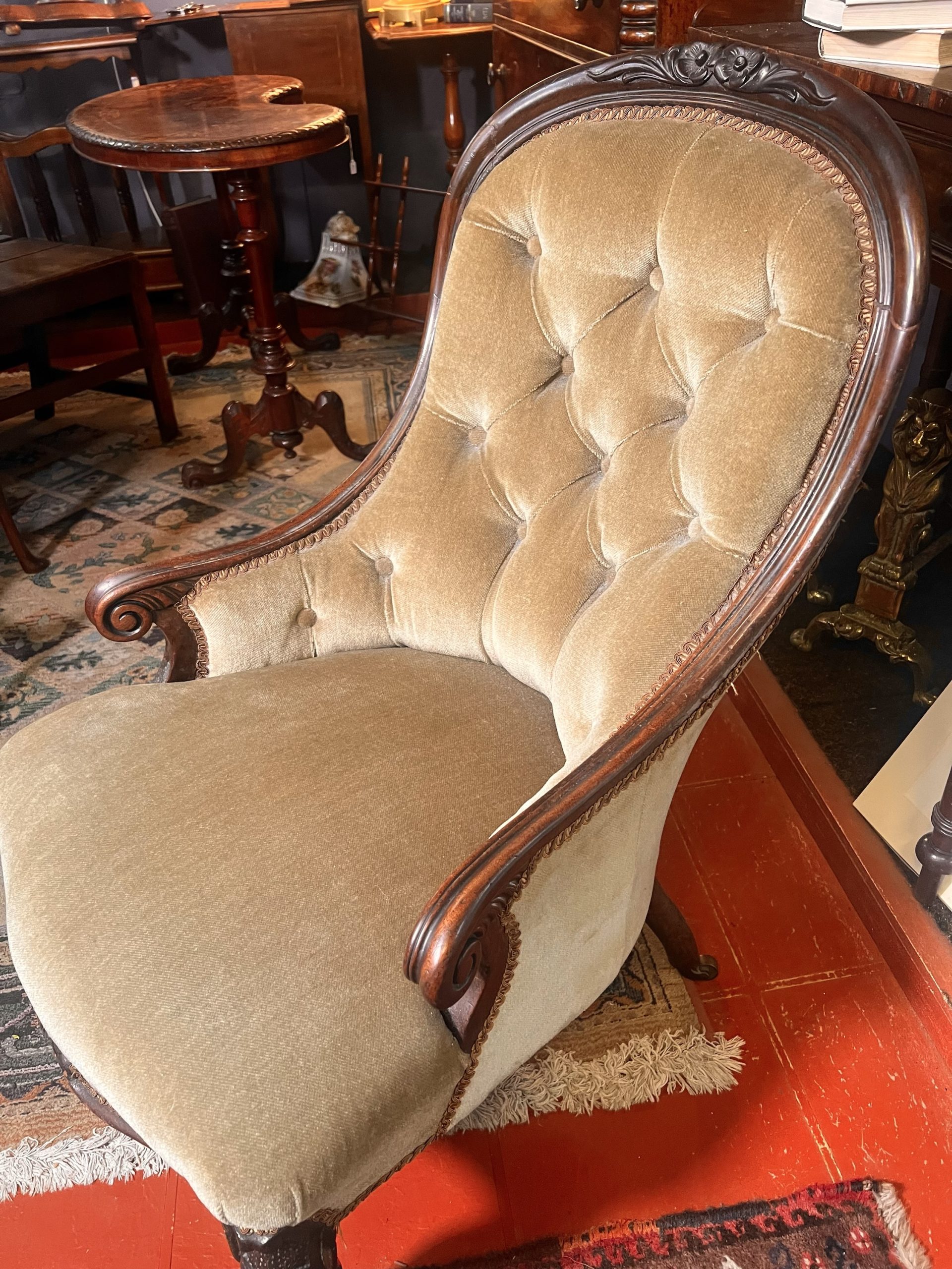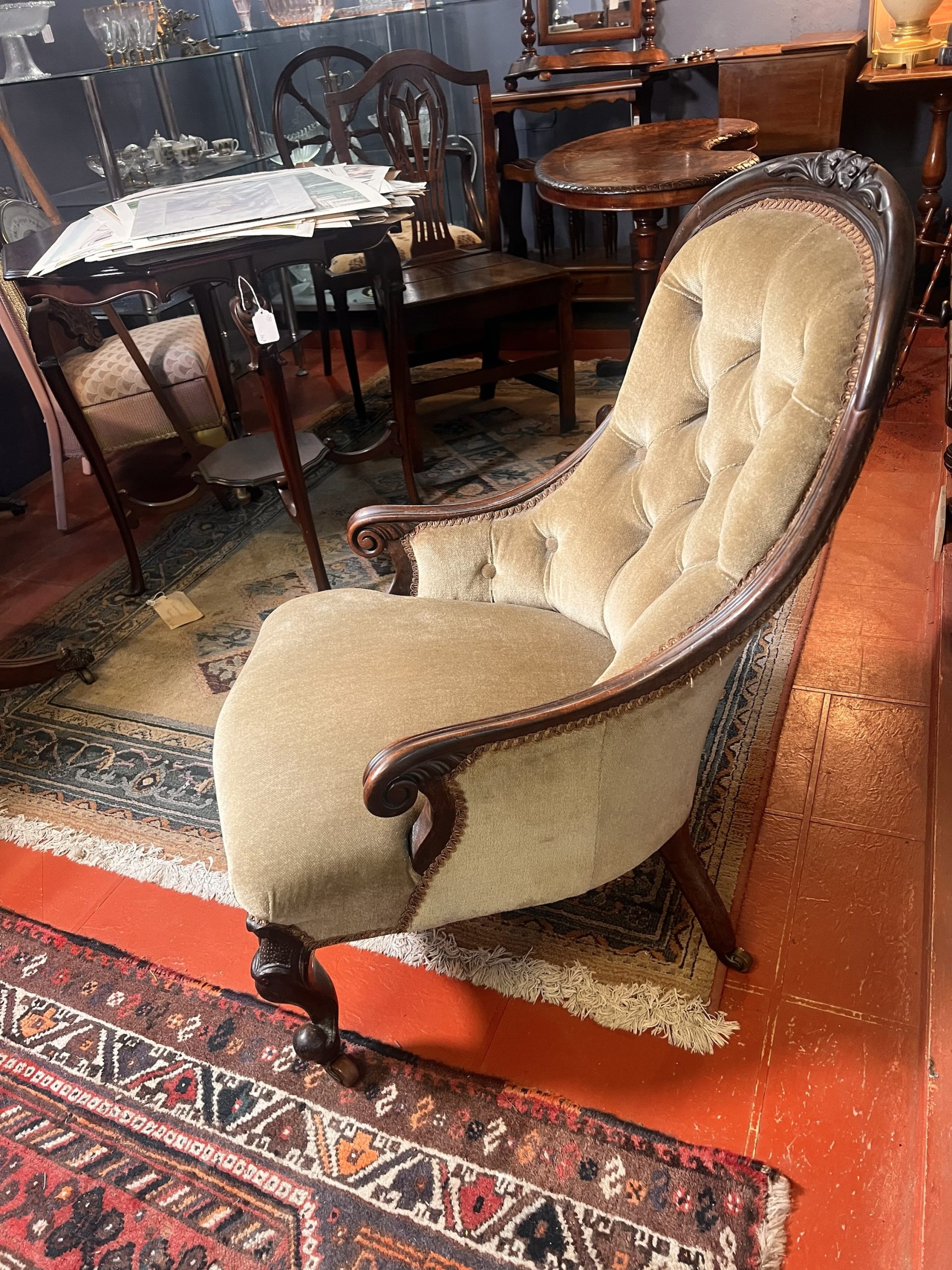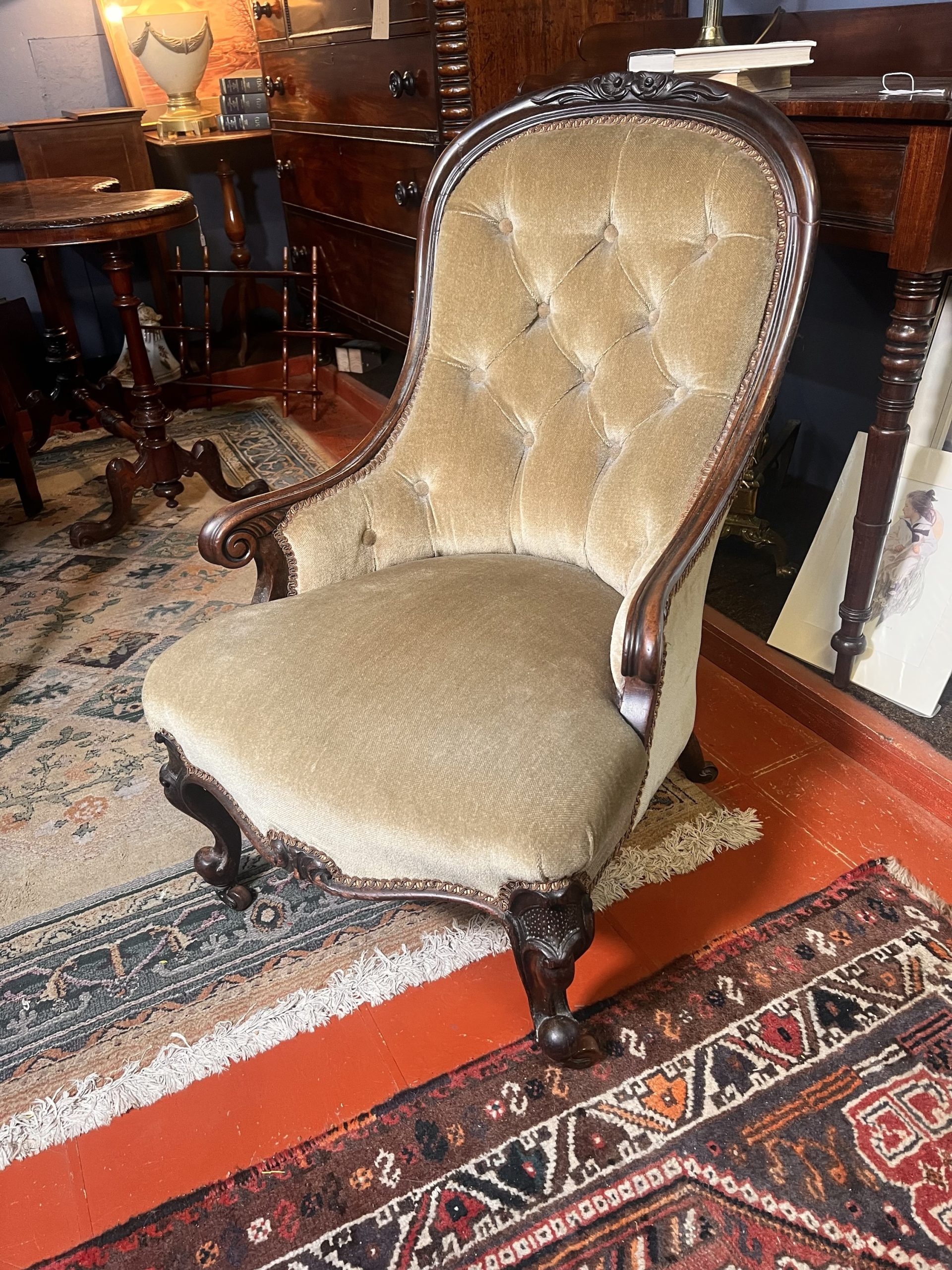 A superb Circa 1860 Mid-Victorian Ladies Chair, crafted from fine solid mahogany and showcasing exceptional 19th-century craftsmanship. This elegant chair features a classic spoon back with button-upholstered panels, set within a moulded back frame that gracefully finishes with a scroll detail at seat level. The back is richly enhanced with foliate carving to the crest, while the chair is raised on beautifully foliate-carved cabriole legs, terminating in original porcelain and brass castors—a true mark of quality and period authenticity. Presented in excellent condition, this antique chair boasts a lovely rich colour to the mahogany and well-preserved upholstery, clearly having been lovingly cared for over the years. Both decorative and functional, it would make a perfect addition to a bedroom, dressing room, or refined sitting area.