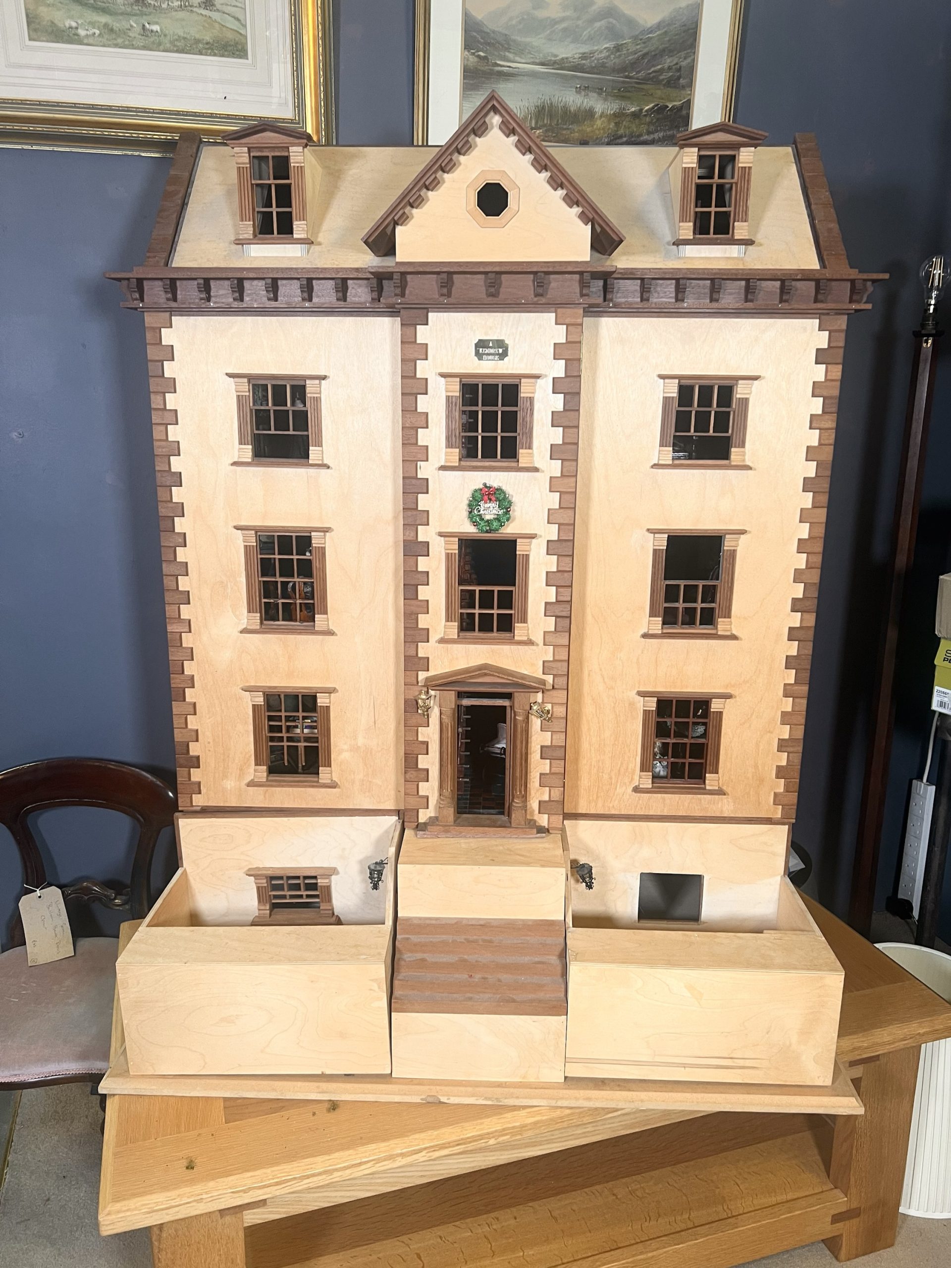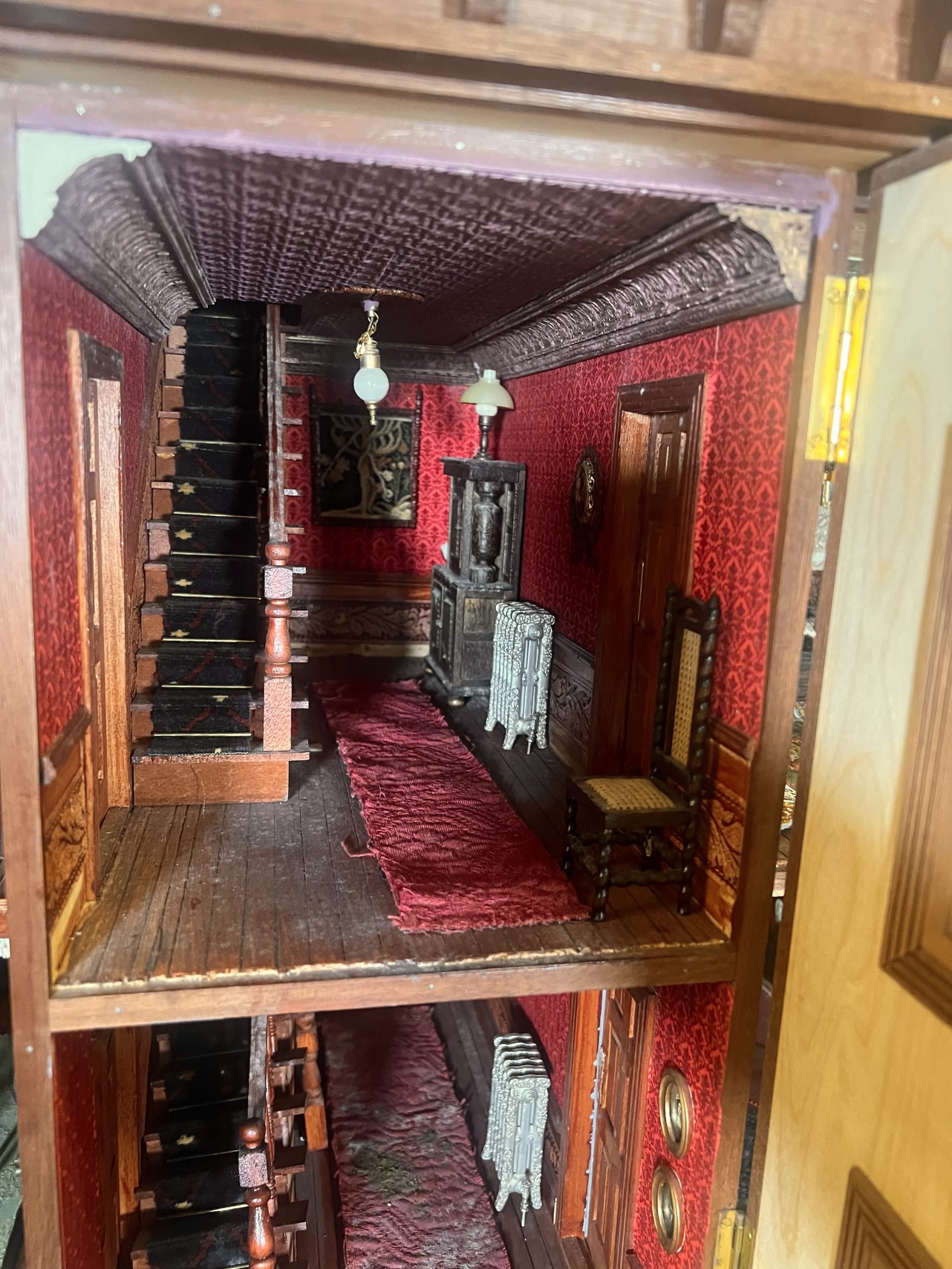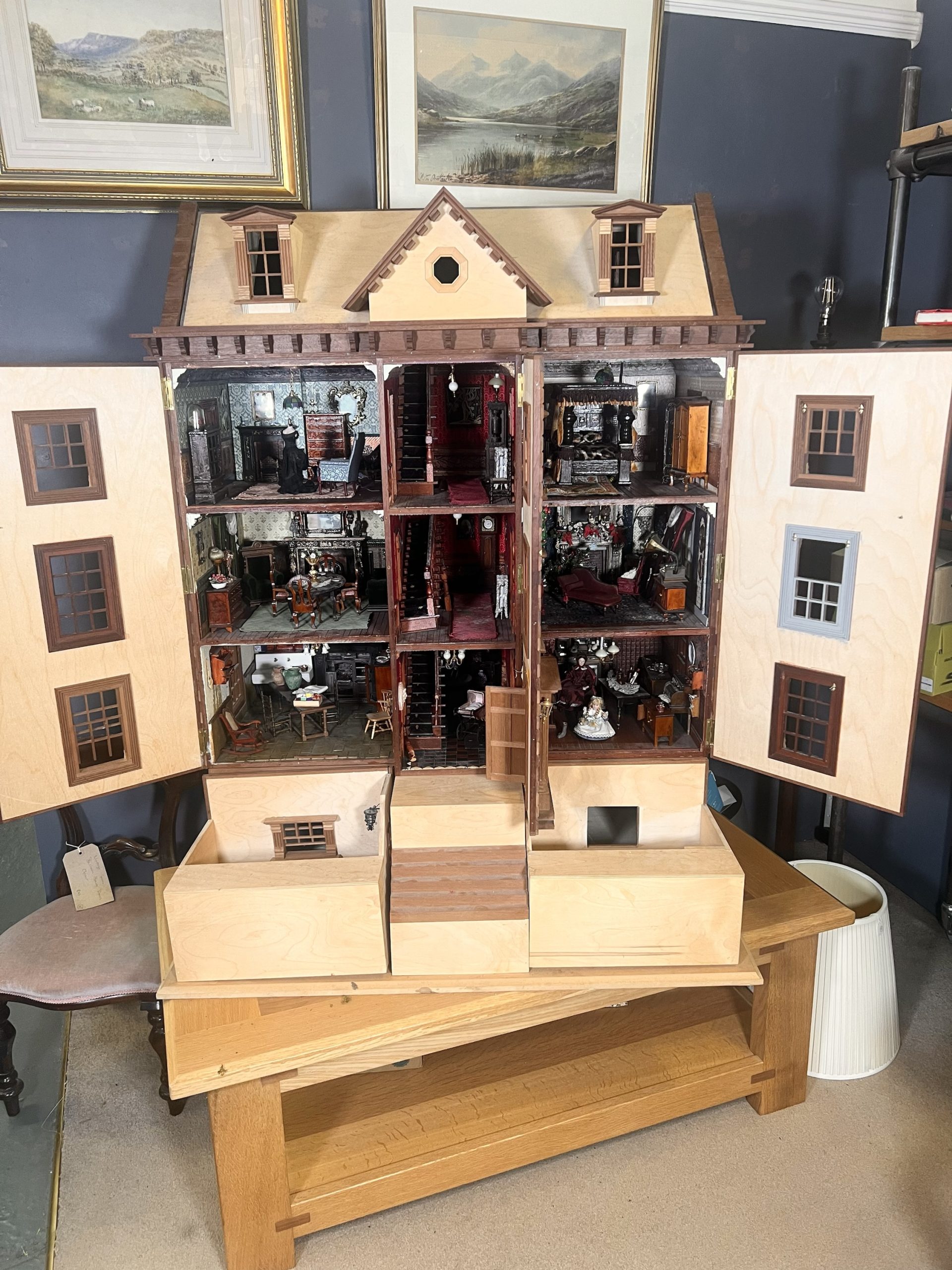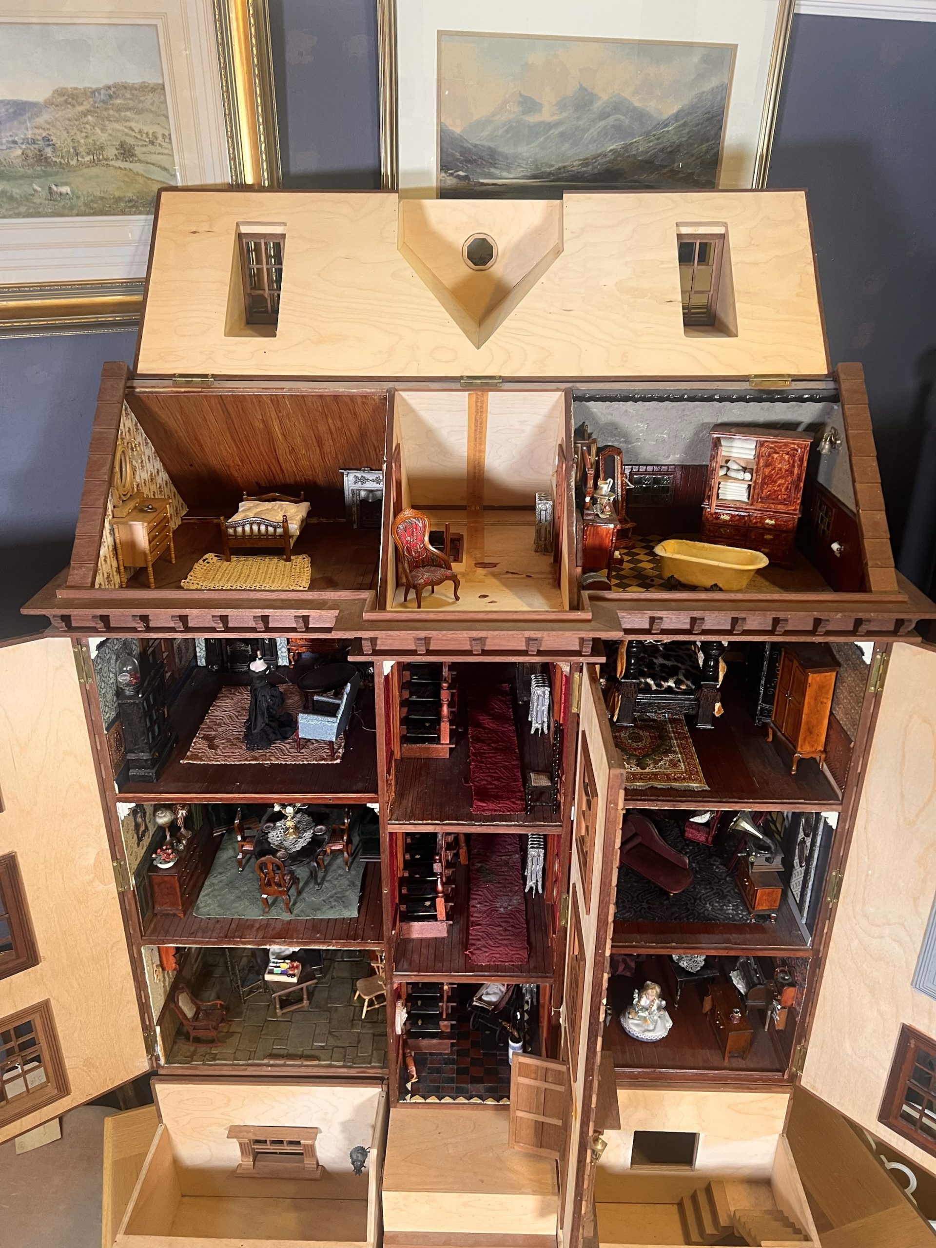 Everything you see is included, carpets, curtains, clothing, furniture, fixtures, fittings, pictures, ornaments and dolls, this dolls house has been lovingly built and furnished over many years, the main house does lift off the basement rooms and as such the main house, with working sash windows, and lighting throughout, there are six main rooms, three hallways with staircases, and removeable basement rooms, the roof is hinged when opened there are two rooms with a central landing, so fourteen rooms in total, a dolls house collector, enthusiast, or very lucky child will appreciate this fabulous house and the quality of the fixtures and fittings, these houses are known to be large and detailed, often considered to be the Rolls Royce of houses, they were commissioned by a company or client named Lectromatic, and Kendrew was a craftsperson who constructed the house according to these specifications, the dimensions areĀ 98cms wide 65cms deep standing 123cms tall, I am happy to deliver locally for a small fee or arrange a courier nationally