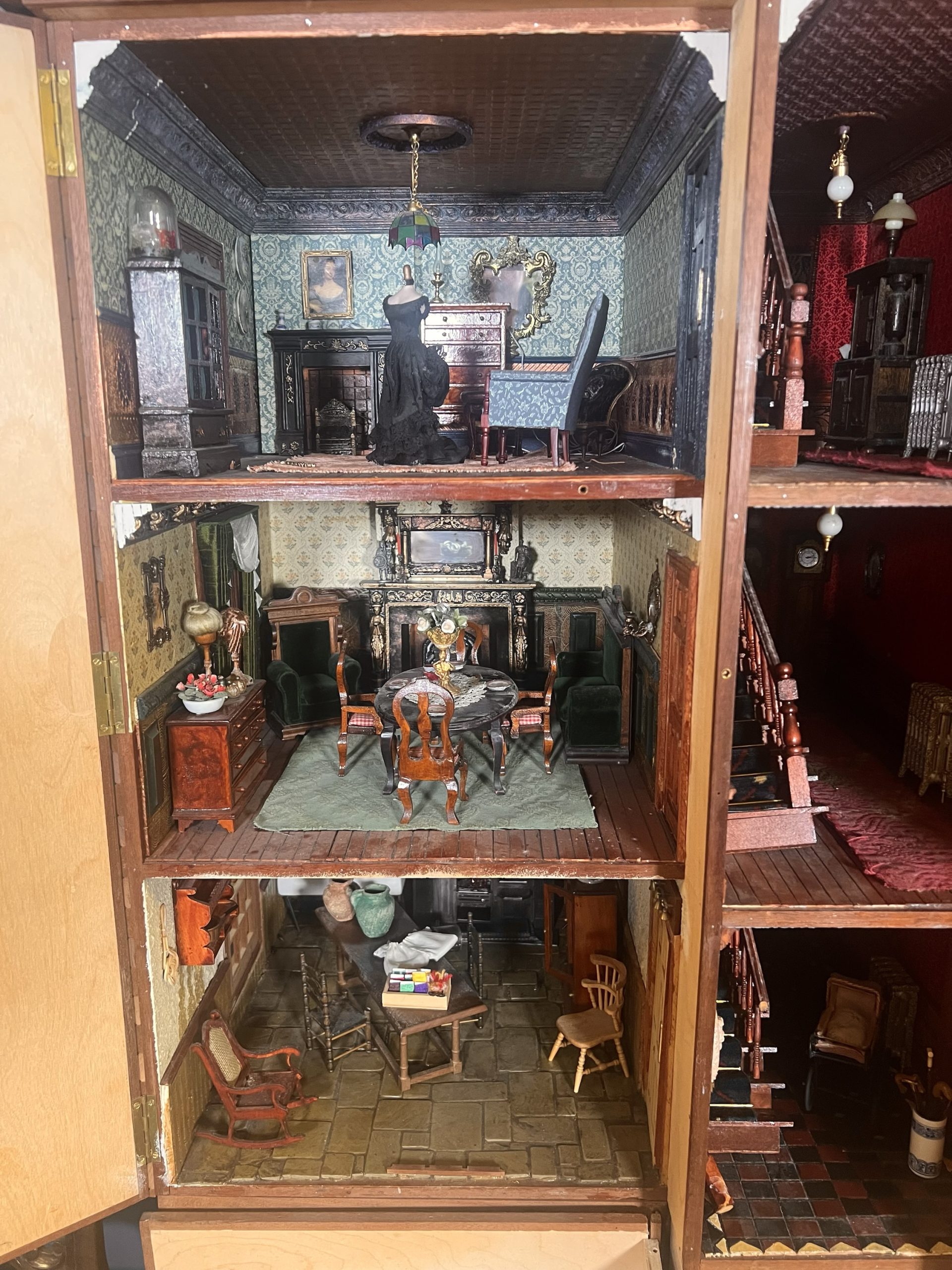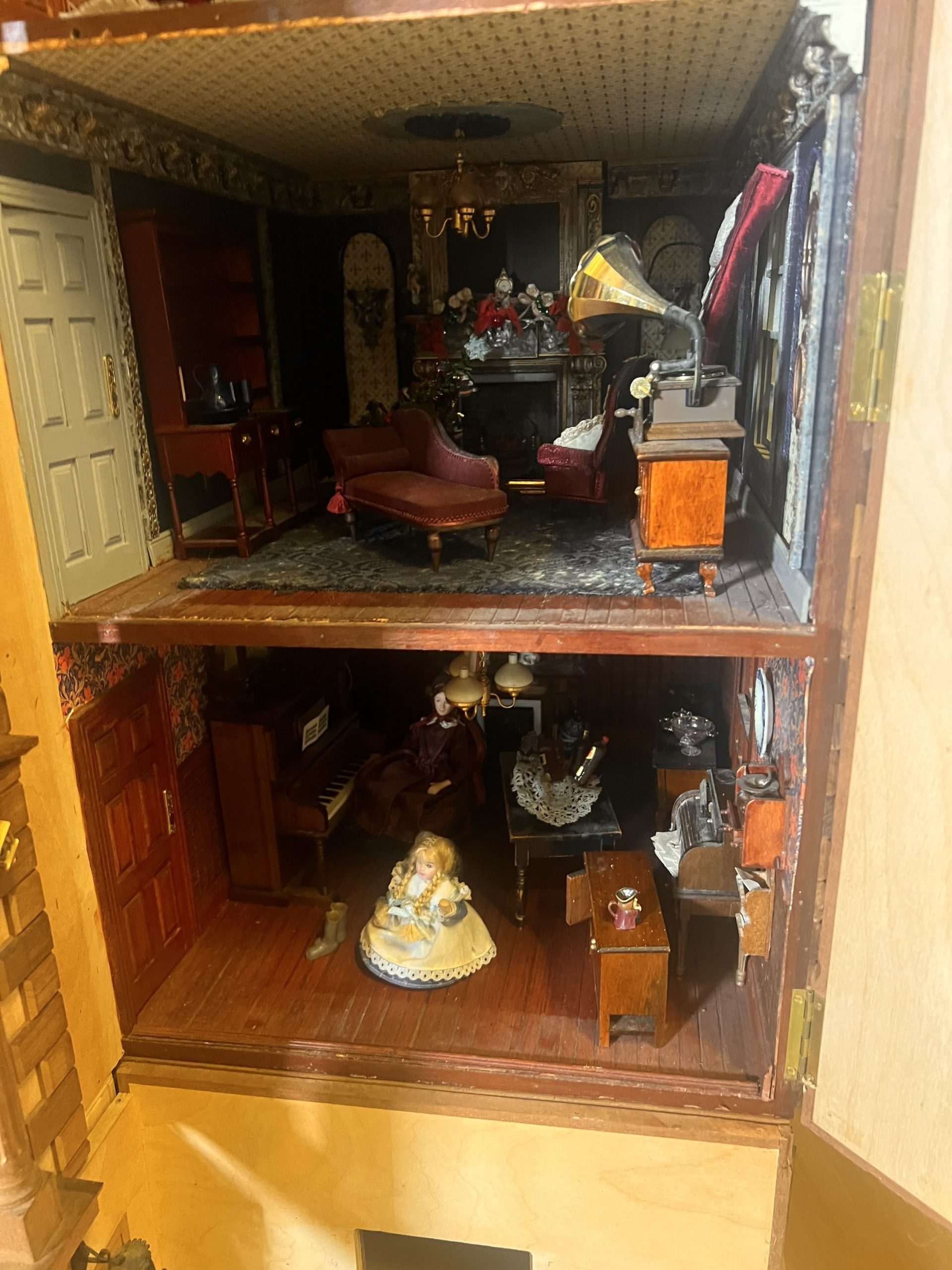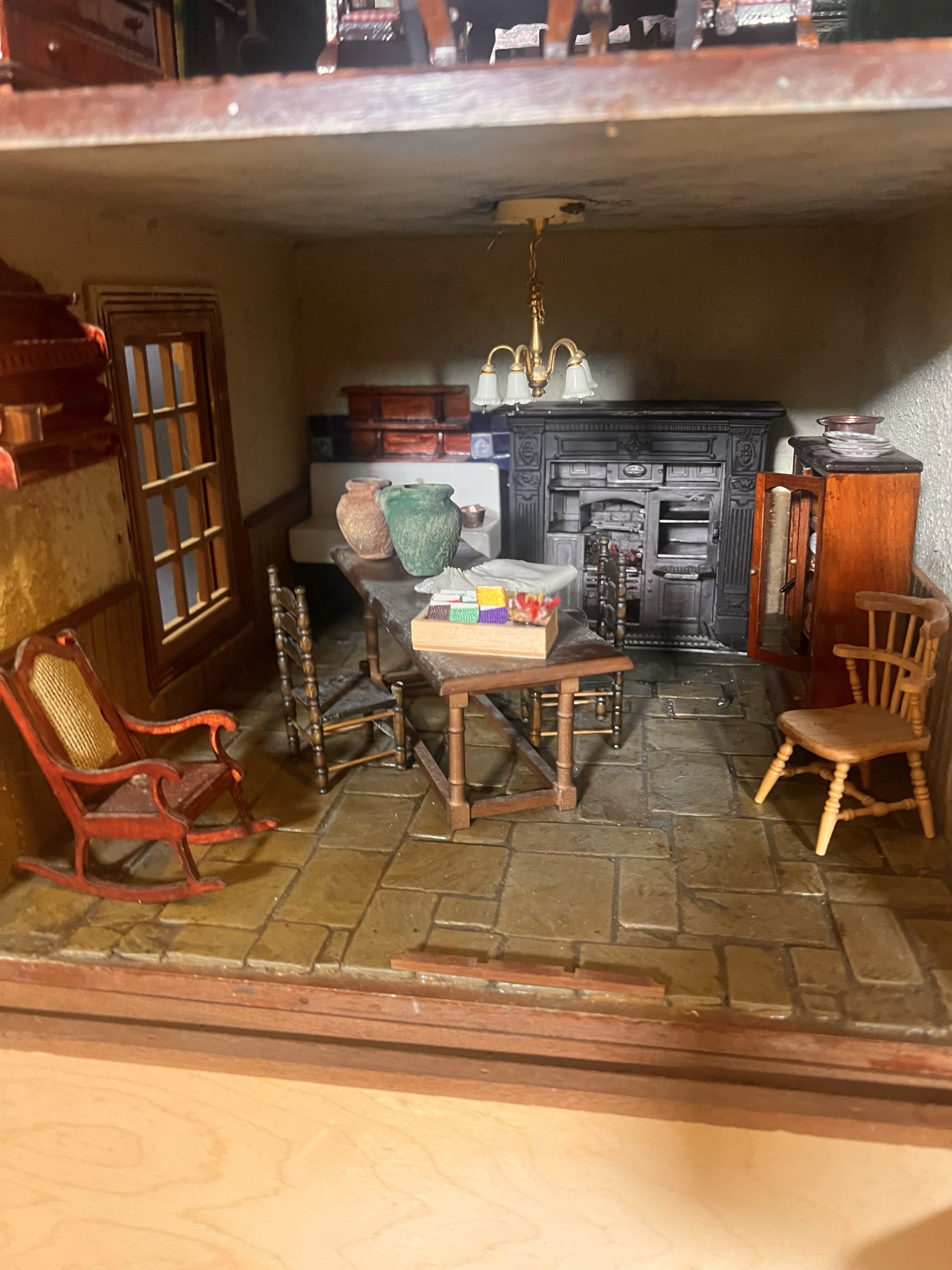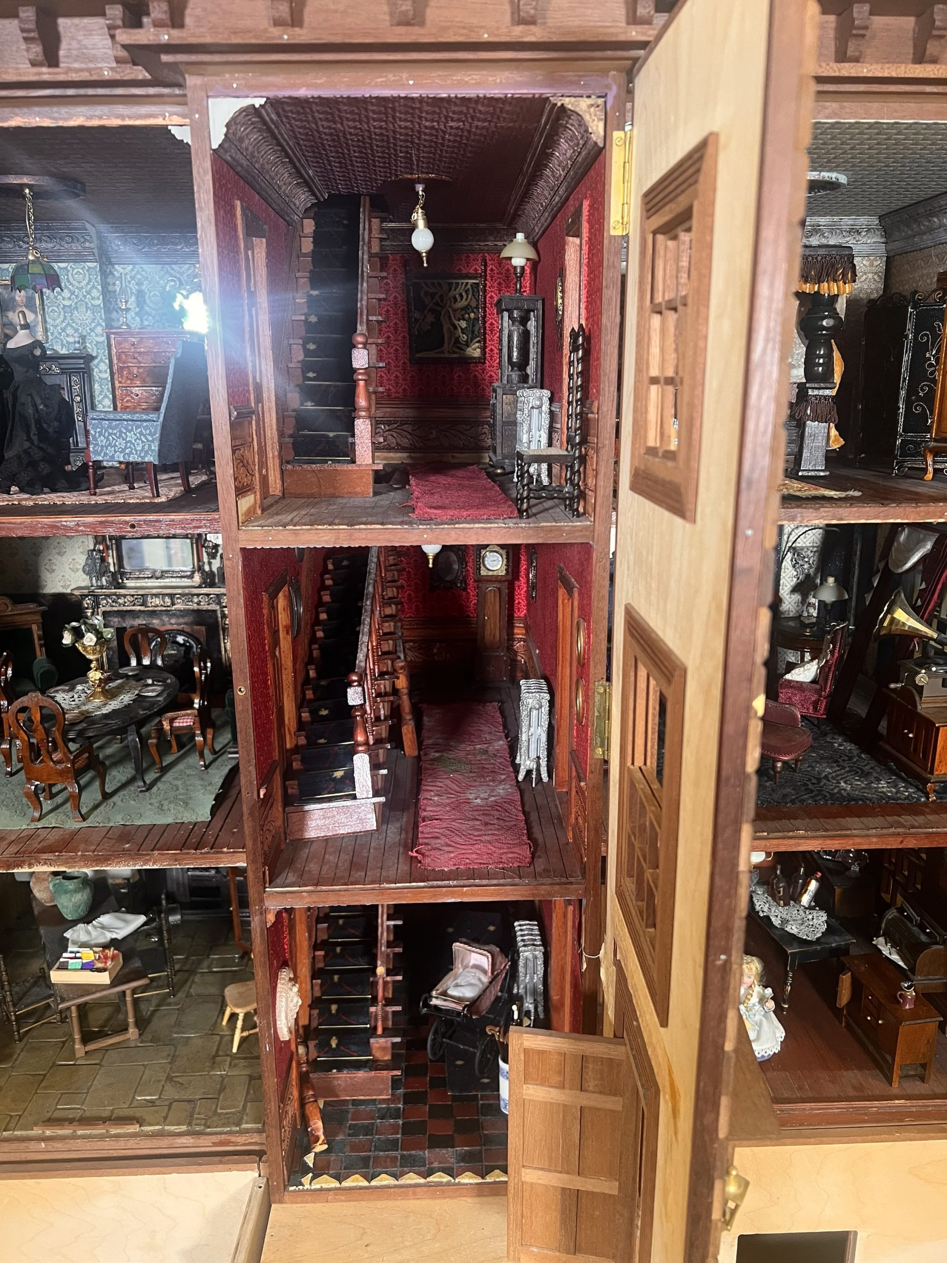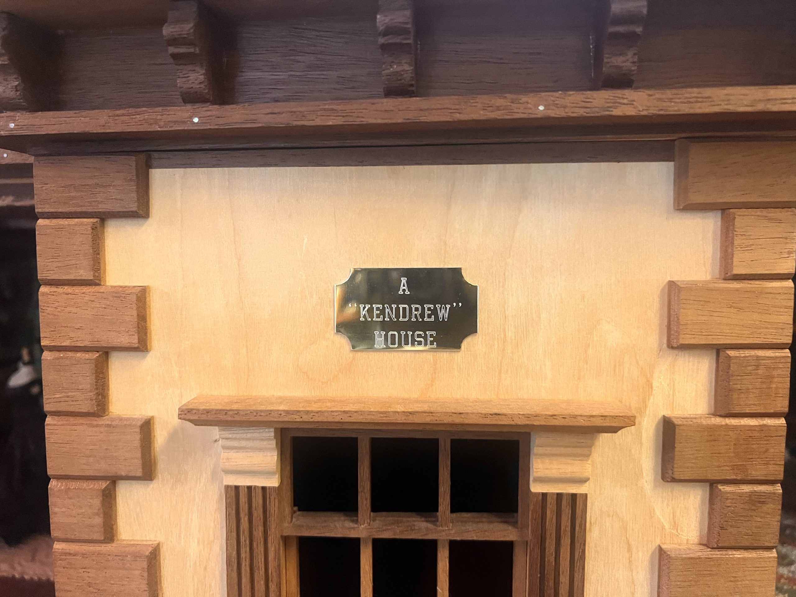 Everything you see is included, carpets, curtains, clothing, furniture, fixtures, fittings, pictures, ornaments and dolls, this dolls house has been lovingly built and furnished over many years, the main house does lift off the basement rooms and as such the main house, with working sash windows, and lighting throughout, there are six main rooms, three hallways with staircases, and removeable basement rooms, the roof is hinged when opened there are two rooms with a central landing, so fourteen rooms in total, a dolls house collector, enthusiast, or very lucky child will appreciate this fabulous house and the quality of the fixtures and fittings, these houses are known to be large and detailed, often considered to be the Rolls Royce of houses, they were commissioned by a company or client named Lectromatic, and Kendrew was a craftsperson who constructed the house according to these specifications, the dimensions areĀ 98cms wide 65cms deep standing 123cms tall, I am happy to deliver locally for a small fee or arrange a courier nationally