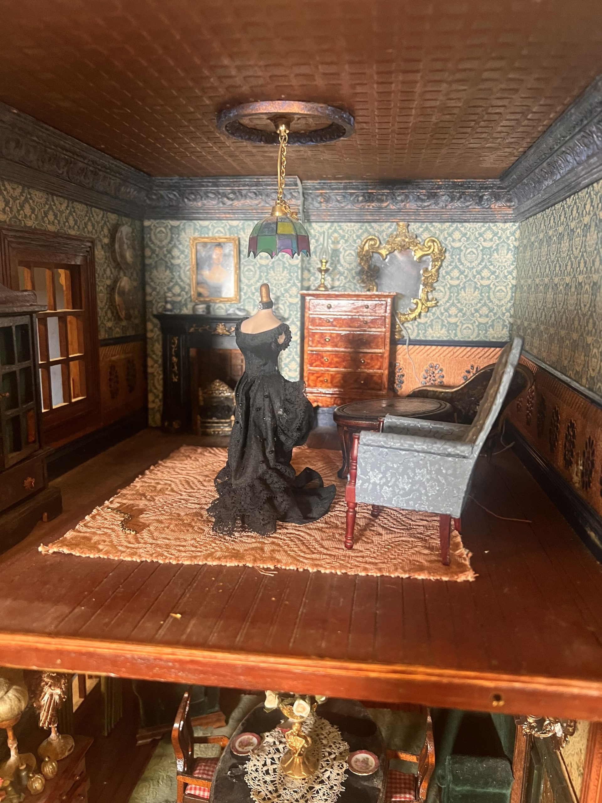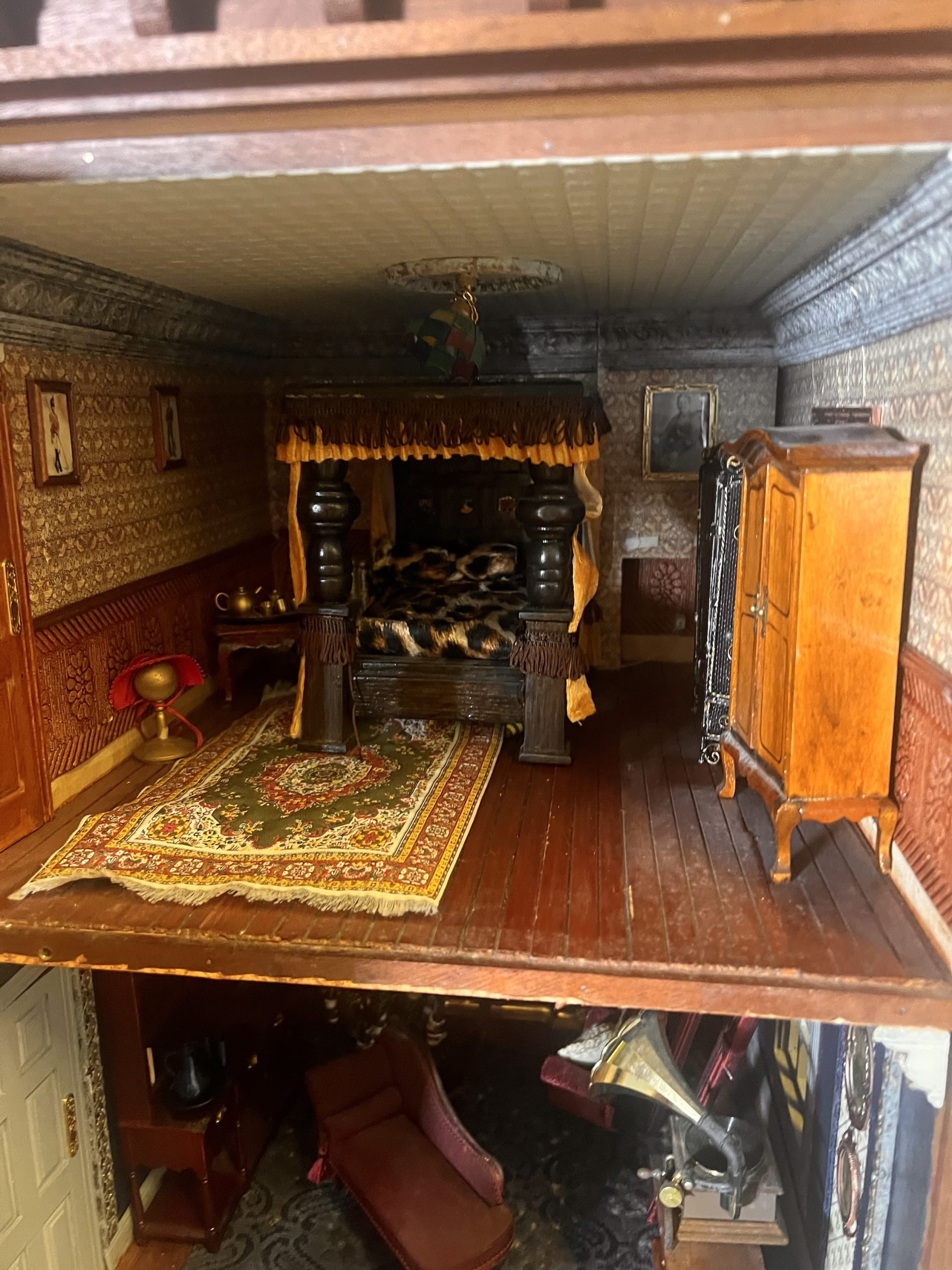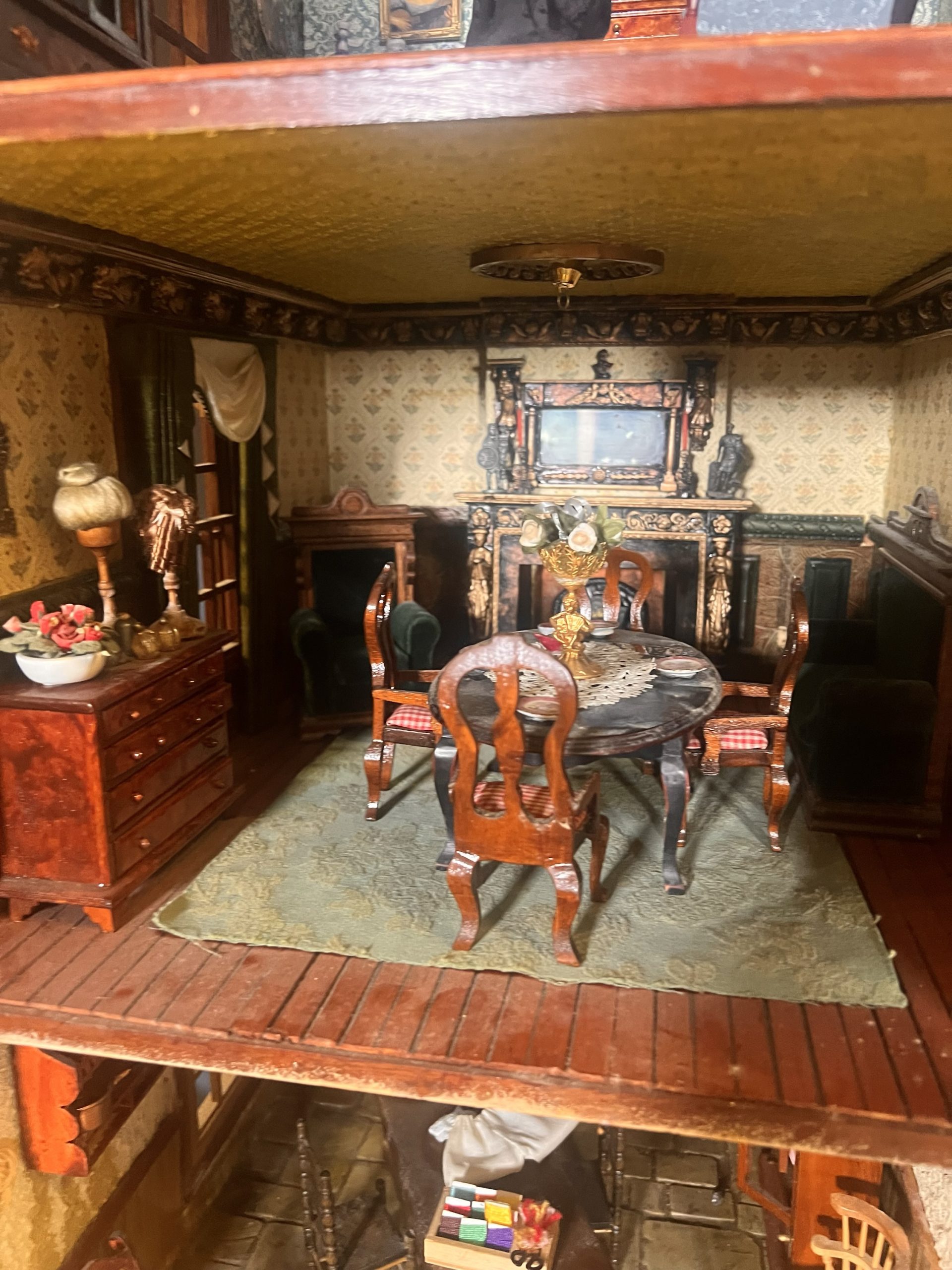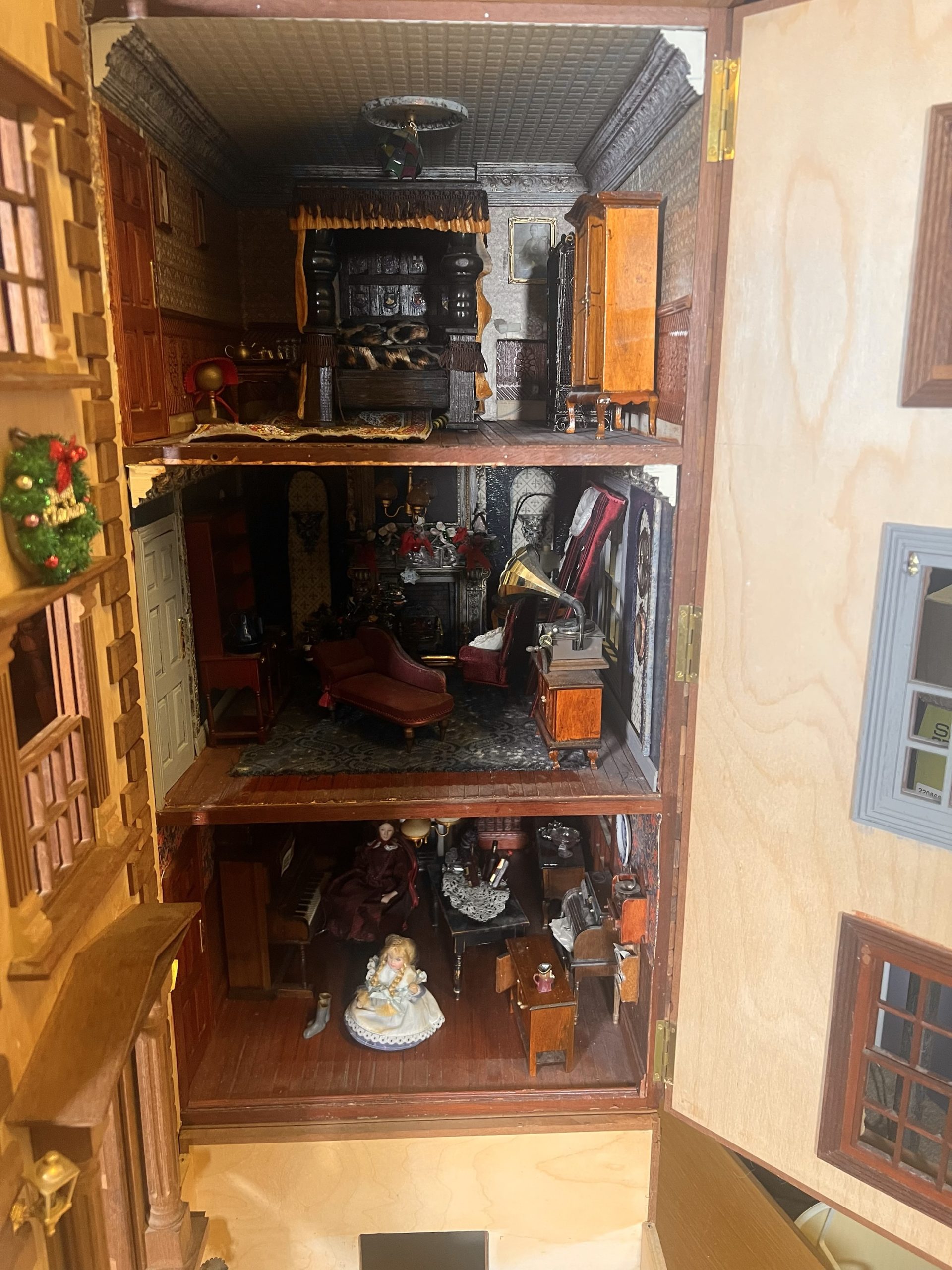 Everything you see is included, carpets, curtains, clothing, furniture, fixtures, fittings, pictures, ornaments and dolls, this dolls house has been lovingly built and furnished over many years, the main house does lift off the basement rooms and as such the main house, with working sash windows, and lighting throughout, there are six main rooms, three hallways with staircases, and removeable basement rooms, the roof is hinged when opened there are two rooms with a central landing, so fourteen rooms in total, a dolls house collector, enthusiast, or very lucky child will appreciate this fabulous house and the quality of the fixtures and fittings, these houses are known to be large and detailed, often considered to be the Rolls Royce of houses, they were commissioned by a company or client named Lectromatic, and Kendrew was a craftsperson who constructed the house according to these specifications, the dimensions areĀ 98cms wide 65cms deep standing 123cms tall, I am happy to deliver locally for a small fee or arrange a courier nationally