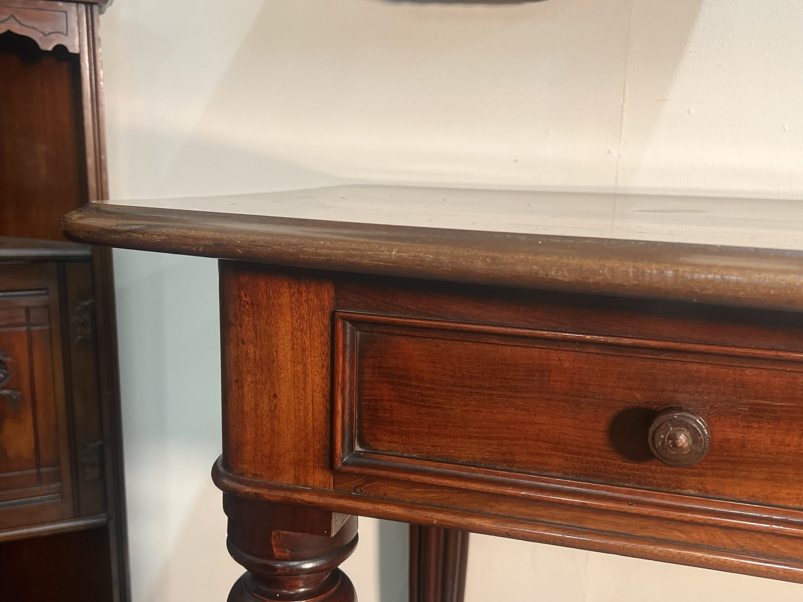 A truly graceful and elegant antique English writing desk or hall table, circa 1840, crafted from solid flame mahogany of exceptional quality. Originally designed as a console table, it fits neatly along a hallway, behind a sofa, or beneath a window, making it both practical and highly decorative.